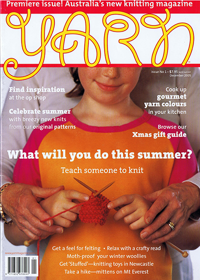 Yarn magazine began via a group of knitters at a pub in Adelaide, SA. As Barbara Coddington, the original editor said, “As knitters and crafters we like to have a yarn as much as we like to play with the stuff, so making a magazine that is smart and fun to read and explore throughout – not just in the patterns section – was essential. We think of it as ‘craft journalism’, rather than simply pretty things to make (although that is important too).”