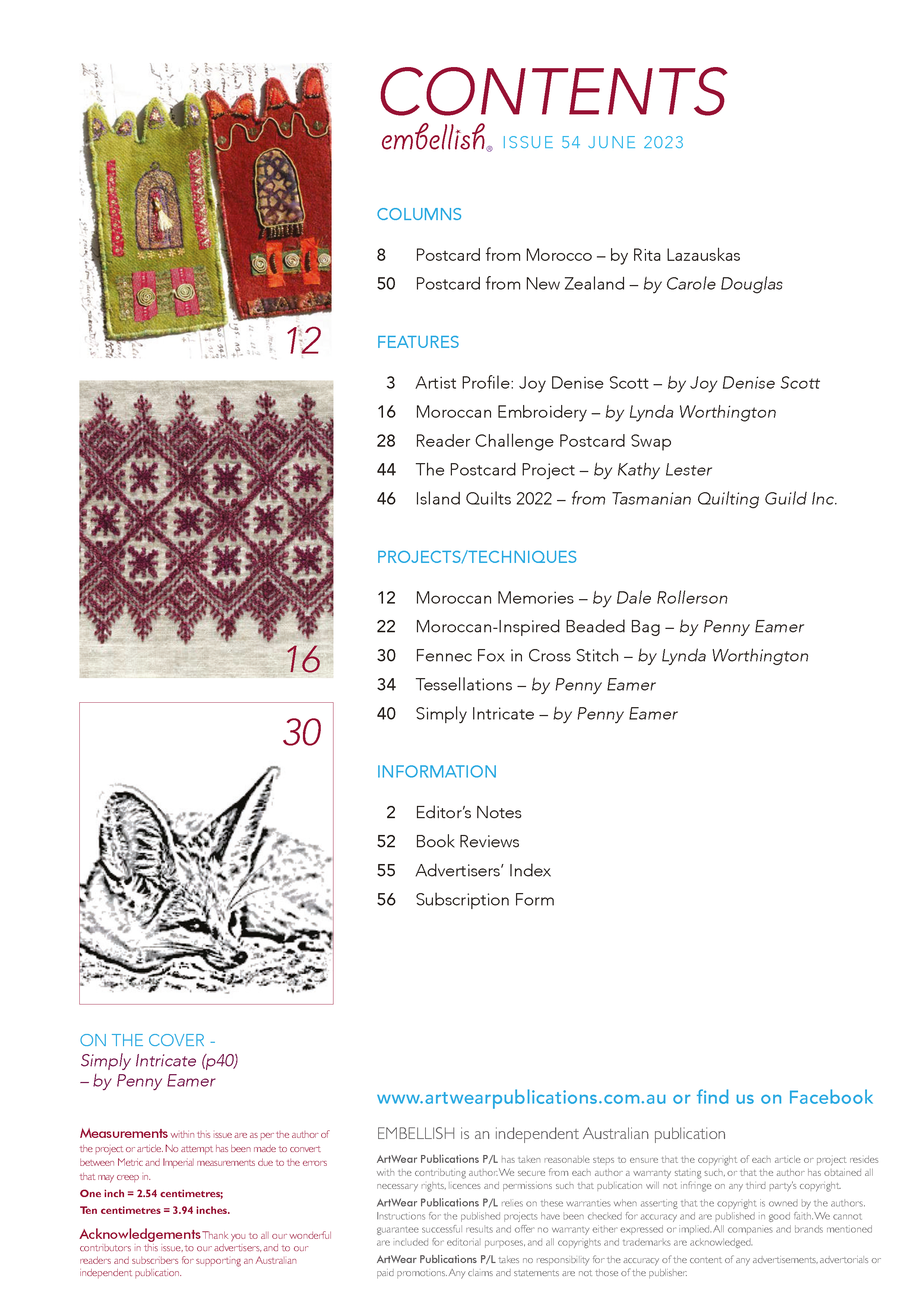 This issue, published June 2023, features inspiration from MOROCCO. Embellish is published each March, June, September and December.
